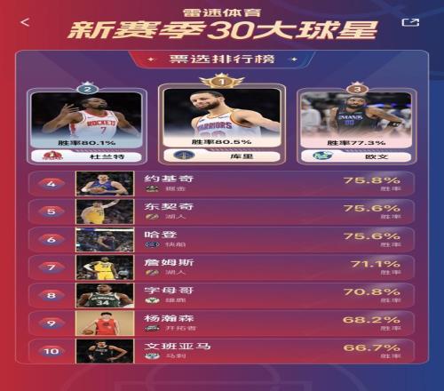 雷速体育10月15日宣 雷速NBA新赛季30大球星活动的第一阶段即将进入最终的尾声