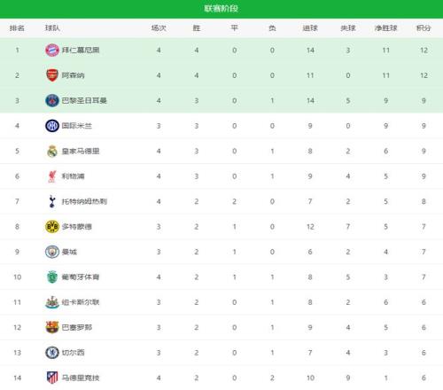 利物浦10皇马+大巴黎12拜仁!欧冠最新积分榜:阿森纳4轮全胜