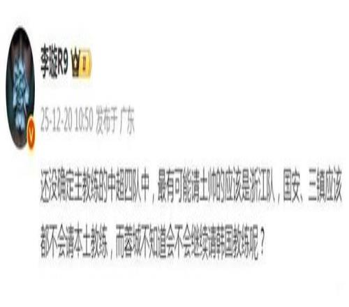 浙江队也是一支奇葩的球队,送走合作多年的乔迪,请来卡内达干了一年,分手。要请土帅了。12月20日,媒体人李璇微博透露:“还没确定主教练的中超四队中,最有可能请土帅的应该是浙江队,北京国安、武汉三镇应该都不会请本土教练,而成都蓉城不知道会不会继续请韩国教练呢?”