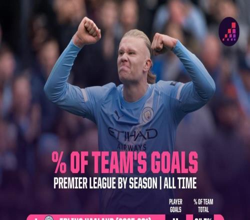 哈兰德本赛季进球数占曼城全队64.7%,若维持住将破英超纪录 哈兰德本赛季进球数占曼城全队64.7%,若维持住将破英超纪录